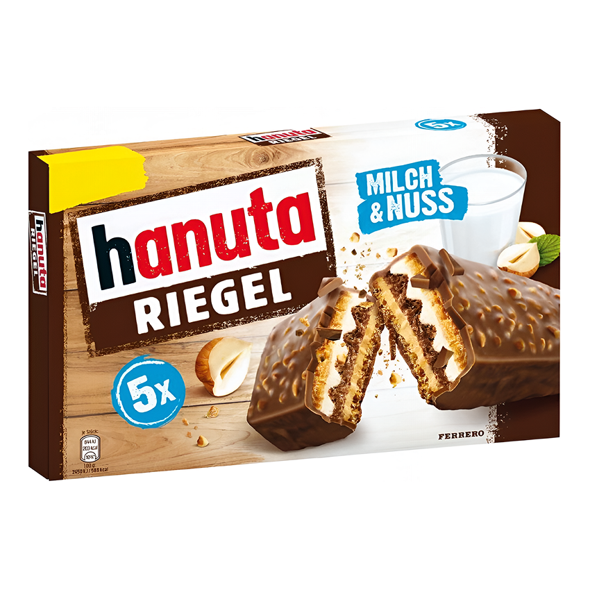 Ferrero Hanuta Riegel - это современный формат культовых вафель Hanuta, представленный в виде плотных батончиков. Хрустящие вафли сочетаются с насыщенной орехово-шоколадной пастой и покрытием из молочного шоколада. Вкус яркий, сладкий, с выраженными ореховыми нотами. Отлично подойдёт для подарков, перекусов и сладких ассорти.