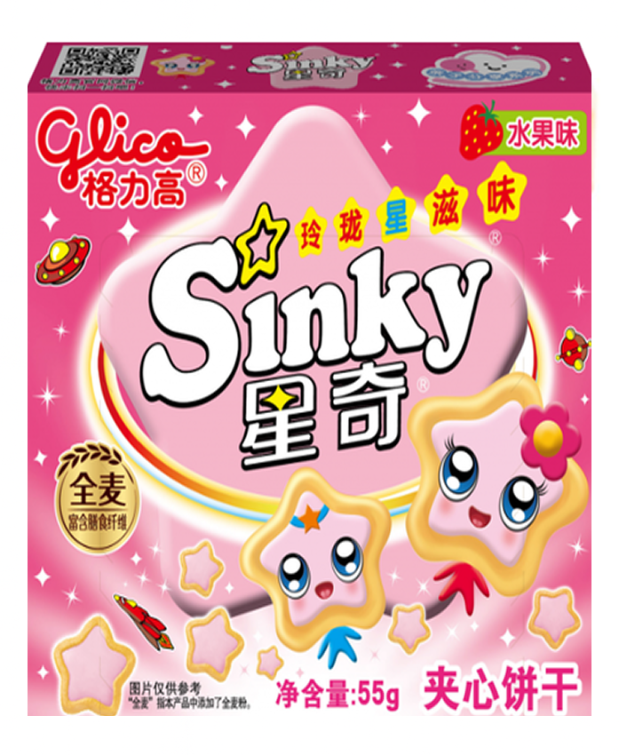 Печенье Sinky в виде звезд с клубничным/шоколадным/ченричным наполнителем. Печенье было придумано китайским отделение компании Glico. Глико - производитель такого известно печенья, как палочки Pocky.