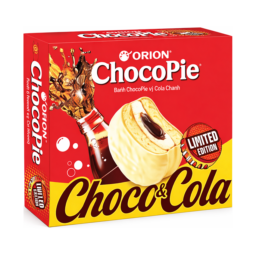 Бисквитное пирожное Orion Choco Pie со вкусом колы предлагает необычное сочетание классического шоколадного бисквита и ароматной кремовой начинки с характерными нотами газированного напитка. Мягкая текстура и оригинальный вкус делают десерт запоминающимся и подходящим для разнообразия привычного чаепития.
